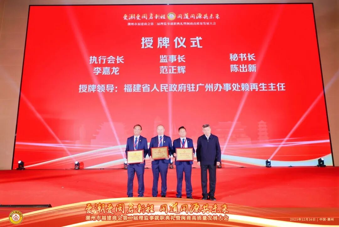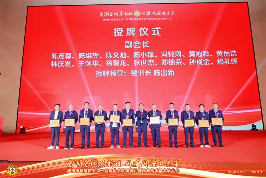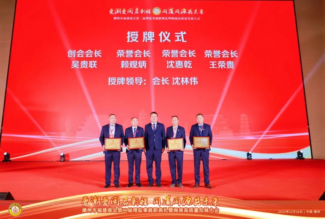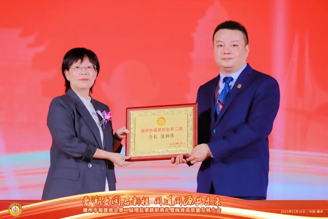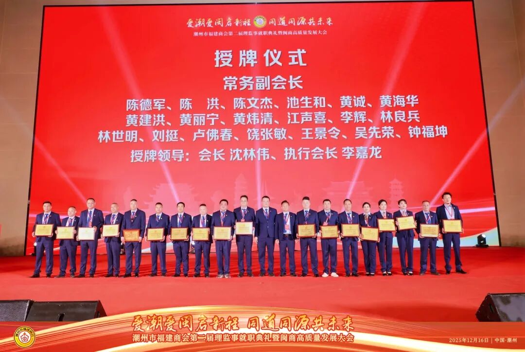 2025年12月16日,以“爱潮爱闽启新程,同道同源共未来”为主题的潮州市福建商会第二届理监事就职典礼在潮州市国际会展中心隆重举行。典礼现场高朋满座,乡情洋溢,共同见证了潮州市福建商会发展历程中的重要时刻。广东省福建商会常务副会长沈林伟就任潮州市福建商会第二届会长。广东省福建商会执行会长徐丽萍,常务副会长吴木光、廖名建、刘锦麟、张培昆、黄天准,副会长赖礼晖、蔡桂锋等参加典礼。