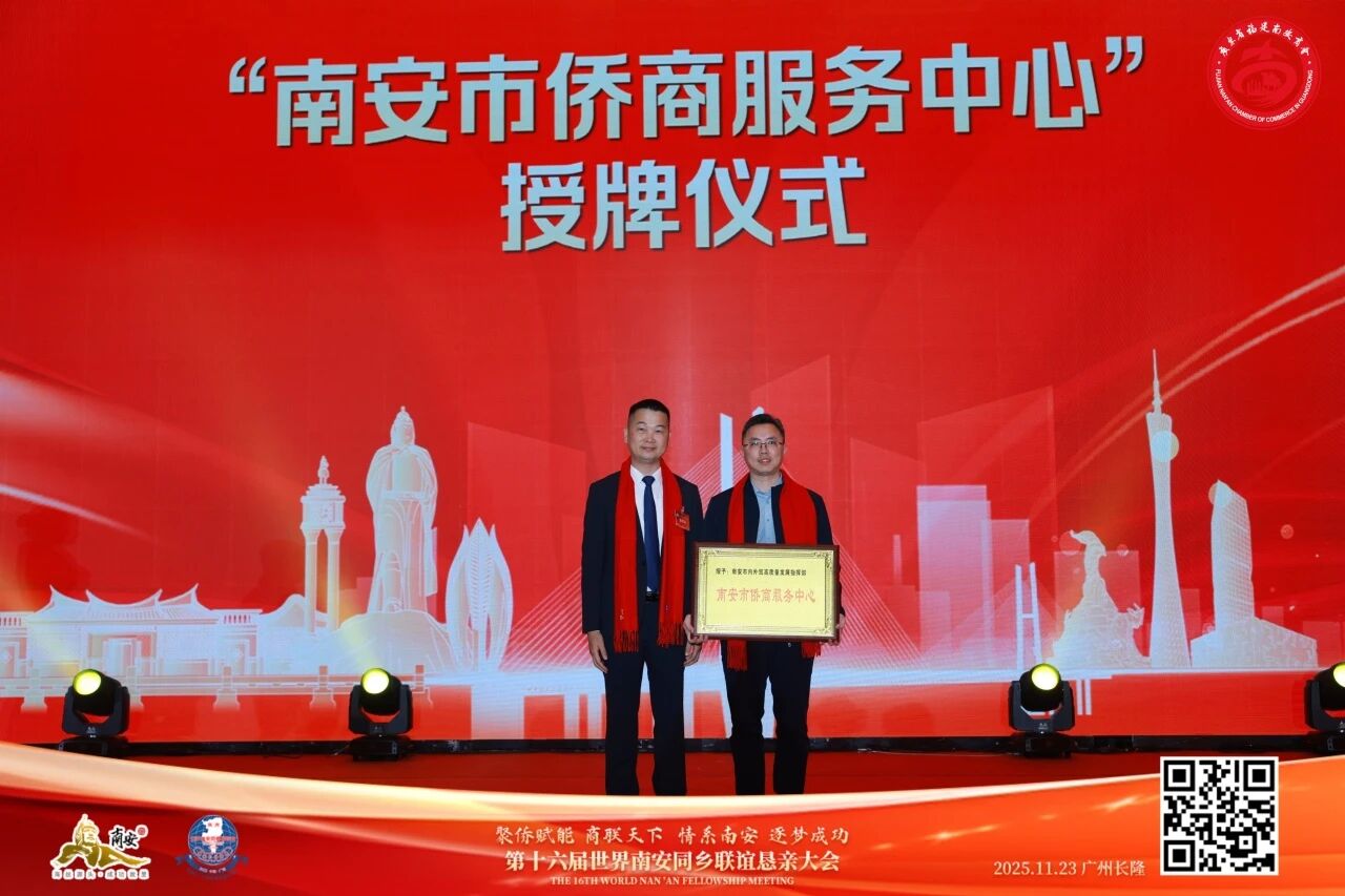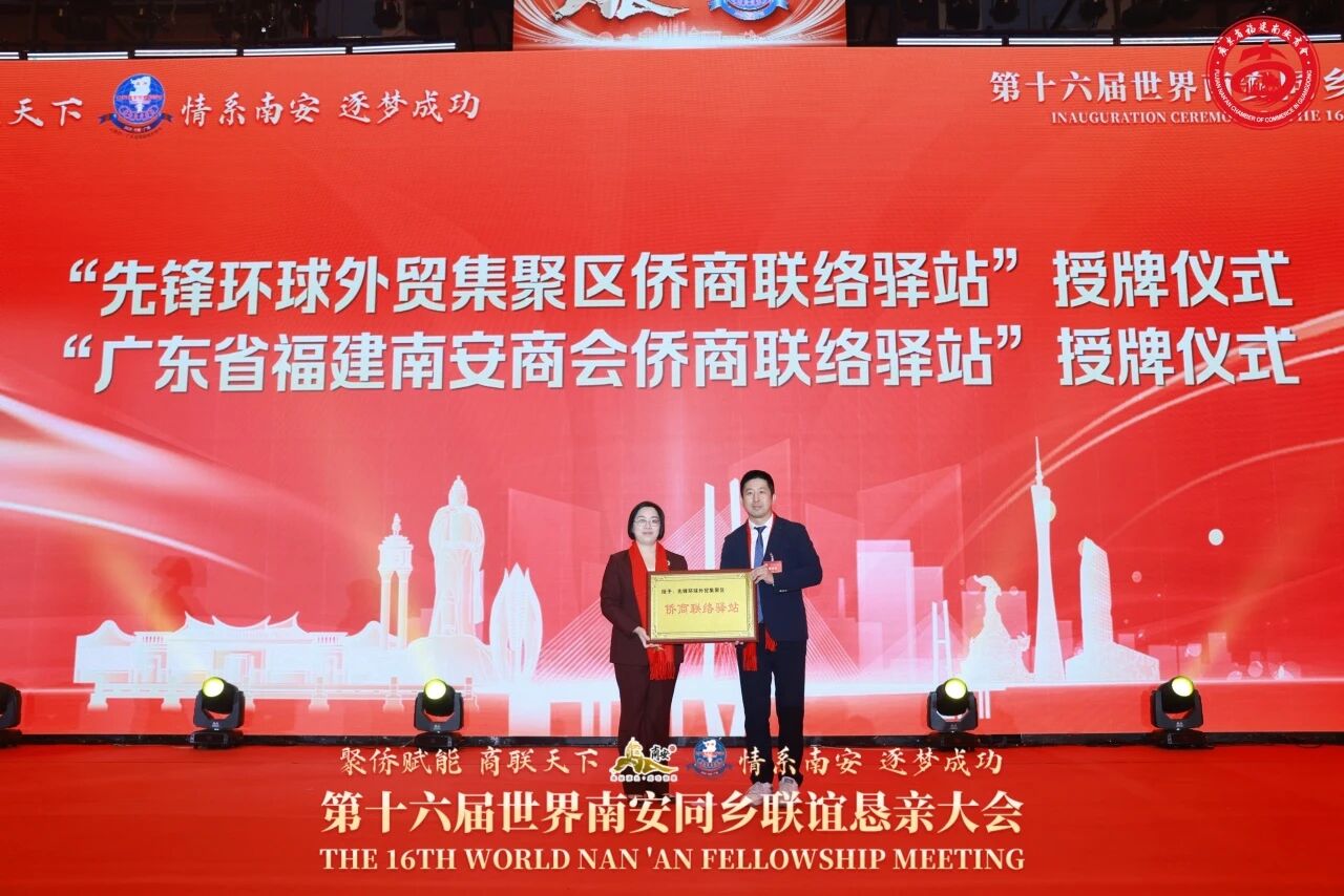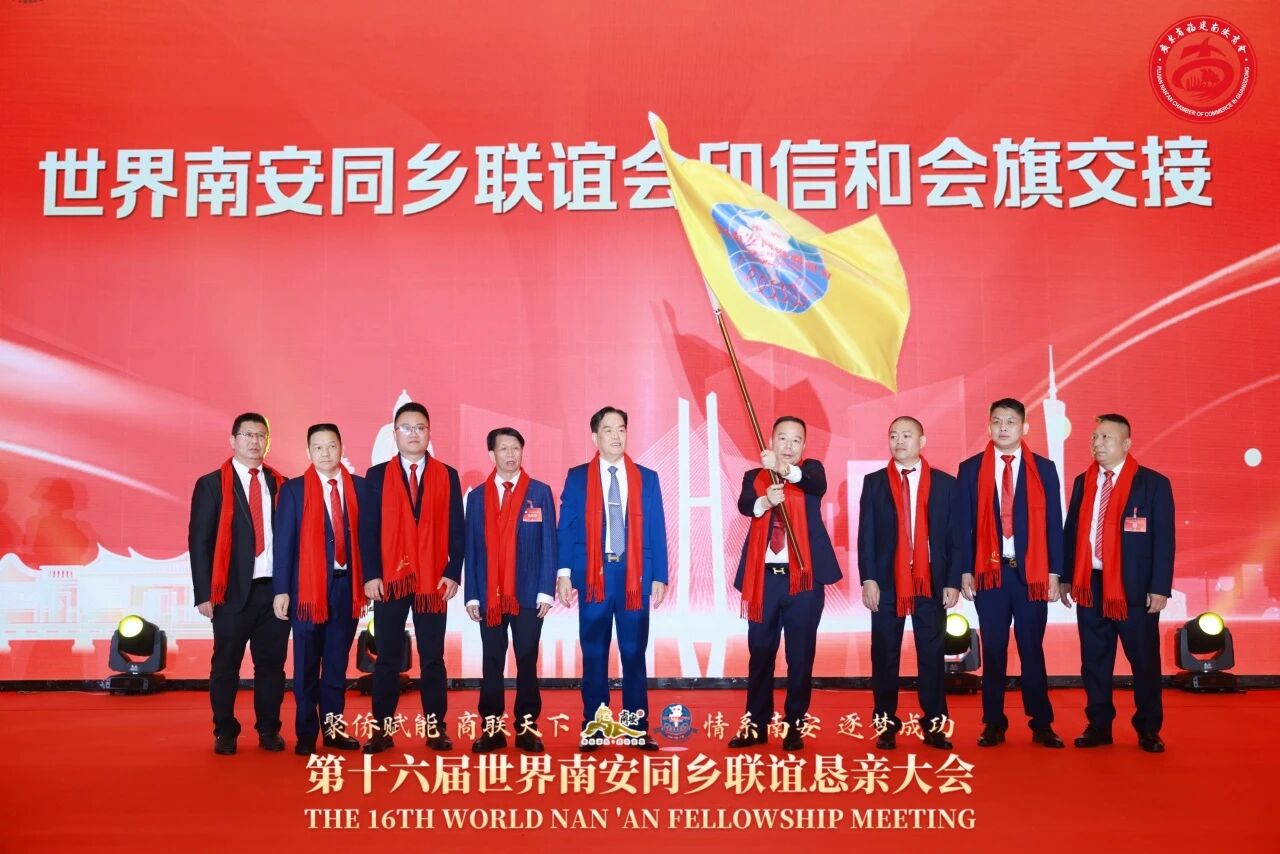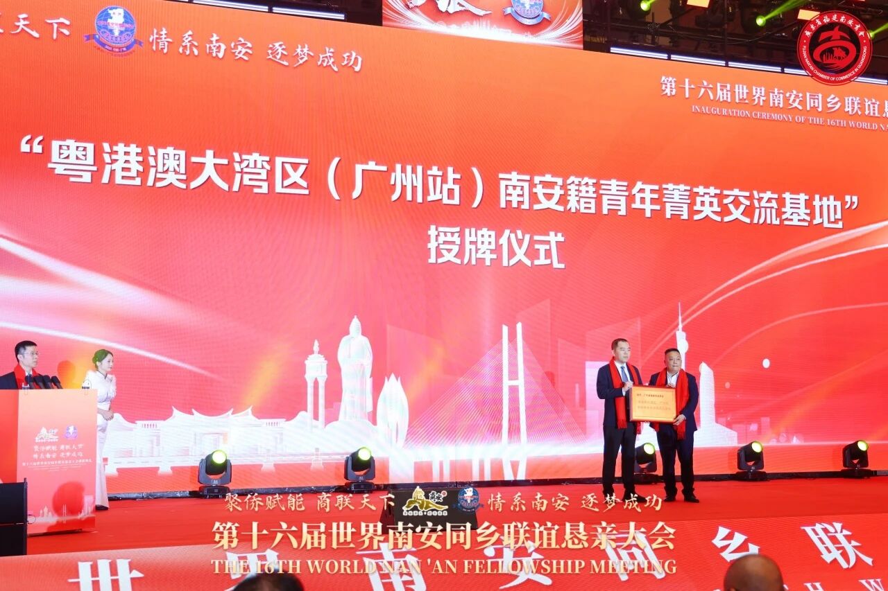 现场还举行第十六届世界南安同乡联谊恳亲大会主席授牌和印信、会旗交接仪式,并为南安市侨商服务中心、先锋环球外贸集聚区侨商联络驿站、广东省福建南安商会侨商联络驿站、粤港澳大湾区(广州站)南安籍青年菁英交流基地授牌。